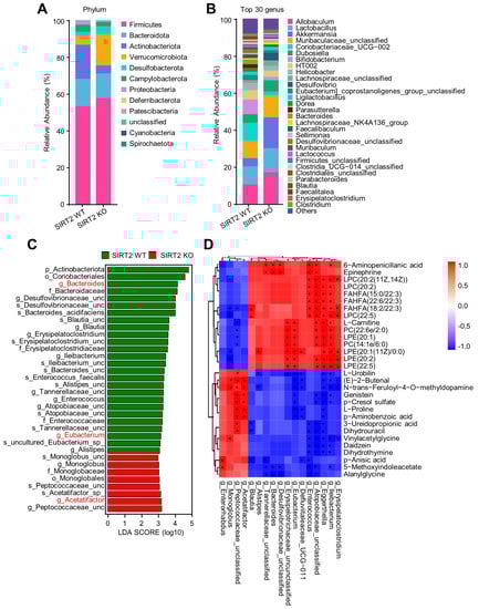 SIRT2 deficiency modulated gut microbiota dysbiosis in HFCS−feeding mice. (A) Relative abundance of gut microbiota at the phylum level in SIRT2 KO and WT mice (N = 3/per group). (B) The top 30 gut microbiota at the genus level in SIRT2 KO and WT mice. (C) LEfSe analysis at different taxonomy levels between the SIRT2 KO and SIRT2 WT mice. The “_unc” stands for “_unclassified”. (D) Correlation analysis between the differential serum metabolites and the differential gut microbiota at the genus level. * p < 0.05.