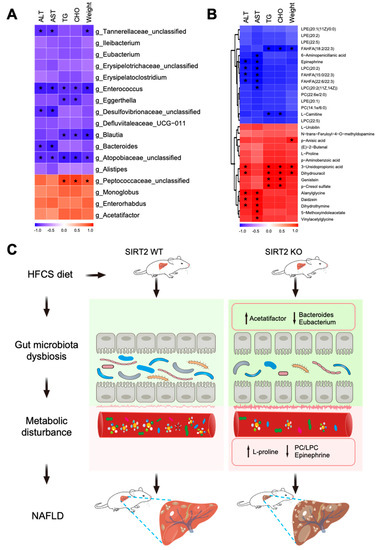 Correlation among gut metabolism, serum metabolites, and mouse phenotype. (A) Spearman’s correlation analysis between the differential gut microbiota at the genus level and the mouse phenotype. (B) Spearman’s correlation analysis between the differential serum metabolites and the mouse phenotype. The correlation analysis value is represented by the colors of the grinds. (C) A proposed model depicting the regulatory mechanism of SIRT2 deficiency in the progression of NAFLD. * p < 0.05.