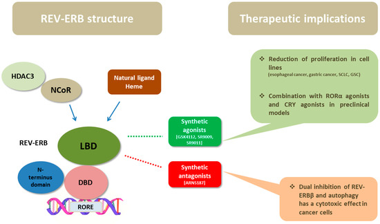 The structure of REV-ERBs consists of three main domains: the DBD, the LBD, and the N-terminus domain allowing activity modulation. Heme, the natural ligand of REV-ERBs binds to LBD and enhances the recruitment of NCoR and HDAC3. Their ligand-binding domain has fueled the development of synthetic ligands of REV-ERBs in order to serve as drugs. Synthetic agonists, namely, GSK4112, SR9009, and SR9011, have shown anticancer activity in preclinical studies of esophageal cancer, gastric cancer, SCLC, and glioblastoma stem cells; in some studies the combination of REV-ERB agonists with RORa or CRY agonists was promising. In addition, a synthetic ligand (ARN5187) with dual inhibitory effect in REV-ERBβ and autophagy demonstrated cytotoxic activity in cancer cells. Abbreviations: DBD = DNA-binding domain, LBD = ligand-binding domain, NCoR = nuclear receptor co-repressor, HDAC3 = histone deacetylase 3, REV-ERB = reverse erb, ROR = retinoid-related orphan receptors, CRY = cryptochrome, RORE = ROR-response elements, SCLC = small cell lung cancer, GSC = glioblastoma stem cells.