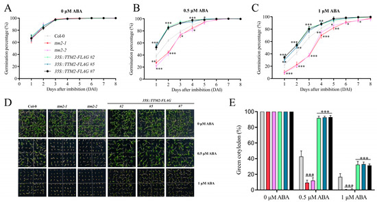Then, we investigated whether changes in TTM2 expression can affect ABA-mediated seed germination. Therefore, we generated 35S::TTM2-FLAG transgenic lines (Figure S3) and assessed their seed germination when treated with ABA. Under normal conditions, the 35S::TTM2-FLAG transgenic plants had similar germination rates to the wild type. However, when germinated on 1/2 MS medium containing 0.5 or 1 μM ABA, compared with the wild type, the germination rate of 35S::TTM2-FLAG was higher (Figure 2A–C). Consistent with the germination rate, in the absence of ABA, cotyledon greening of 35S::TTM2-FLAG plants had no difference from the wild type. In the presence of ABA, 35S::TTM2-FLAG plants were hyposensitive to ABA by displaying increased cotyledon-greening percentages compared with the wild type (Figure 2D,E). Combined with the data above that ABA suppresses the expression of TTM2, these results reveal that the repression of TTM2 expression is needed for ABA-mediated inhibition of seed germination and early seedling development.