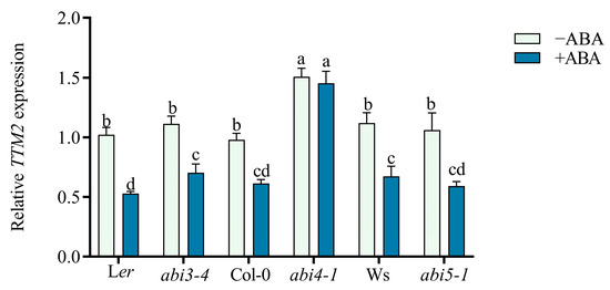 ABI genes are the critical components of the ABA signaling response. Among them, ABI3, ABI4, and ABI5 have been identified as core transcription factors in seed germination [4,18,45]. To investigate how ABA regulates TTM2, we examined TTM2 transcriptional levels in abi mutants. We found that TTM2 expression can be still repressed by ABA in either abi3-4 or abi5-1 compared to the wild type, while the inhibition of TTM2 transcription by ABA in the wild type was abolished in abi4-1 (Figure 3 and Figure S5), indicating ABI4 is essential for ABA-mediated inhibition of TTM2 expression.