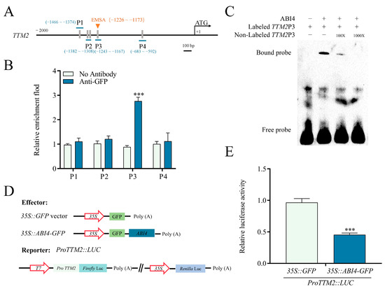 To explore how ABI4 modulates TTM2 expression, we first searched for the CCAC box, an important element in ABI4 target gene promoters [18], in the TTM2 promoter and found five CCAC boxes (Figure 4A). Then, we generated 35S::ABI4-GFP transgenic plants (Figure S6) and used them for chromatin immunoprecipitation (ChIP). Our findings demonstrated that the P3 region of the TTM2 promoter was substantially enriched by anti-GFP in chromatin immunoprecipitated with 35S::ABI4-GFP, indicating ABI4 binding of the P3 region (Figure 4B). Our DNA electrophoretic mobility shift assays (EMSAs) utilizing ABI4 protein produced and purified from E. coli further confirmed this binding. Our results found that the ABI4 protein bound to the P3 probe that was biotin-labeled, while this binding could be completed by an unlabeled version of the DNA probe (Figure 4C). To further substantiate the impact of ABI4 on the modulation of TTM2 expression, we also detected the expression of TTM2 with dual luciferase assays in Nicotiana benthamiana leaves. In these experiments, the reporter vector consists of a firefly luciferase (LUC) gene driven by the TTM2 promoter, the ABI4 gene driven by the CaMV 35S was generated for the effector vector (Figure 4D) and LUC/REN ratio in the dual-LUC assay indicated relative LUC activity. The analysis displayed that the co-expression of 35S::ABI4-GFP and ProTTM2::LUC markedly reduced LUC activity in comparison with the 35S:: GFP and ProTTM2::LUC co-expression (Figure 4E). Taken together, the tests indicated that ABI4 is a transcriptional repressor of TTM2.