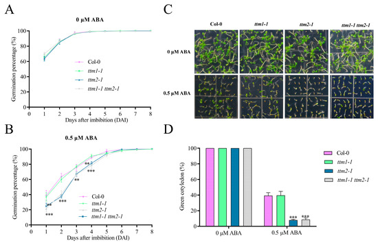 The ttm2-1 and ttm1-1 ttm2-1 mutants exhibited similar responses to ABA during seed germination. (A,B) Seed germination curves. Germination rates are for imbibed Arabidopsis WT (Col-0), knockout mutants (ttm1-1, ttm2-1), and double mutant ttm1-1 ttm2-1 planted to 1/2 MS (A) or 1/2 MS medium with 0.5 μM ABA (B) for germination experiments and then calculated at the indicated times. (C) Seed germination phenotypes. Imbibed seeds were incubated on 1/2 MS medium containing 0 or 0.5 μM ABA for 8 days. (D) Cotyledon greening rate. The green cotyledon rate was measured as (C). Each replicate had at least 100 seeds counted in it. Data are shown as mean ± SD (n = 3). Asterisk denotes a statistically significant difference compared with their wild type at indicated times. **, p < 0.01; ***, p < 0.001 (Student’s t-test).