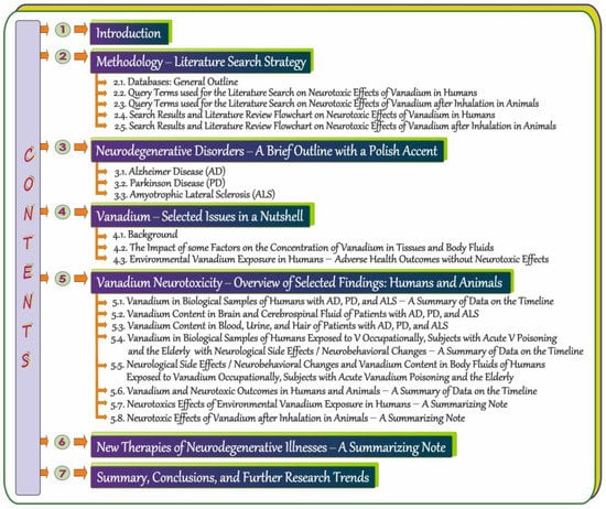 The present review is an attempt to provide thorough knowledge on the influence of vanadium (V) on neurodegeneration in humans. After the Introduction section, in which the main goals are formulated, the review comprises a few main sections and subsections displayed in Figure 1 for the reader’s convenience. Section 2 provides information about the search strategy, i.e., it includes the sources and date of searching, the key terms used to identify records relevant to the topic, and two flowcharts of the literature review process. One of them refers to humans and the other one is focused on animals. Section 3 with a Polish accent provides a concise summary of basic information about certain neurogenerative diseases, i.e., Alzheimer disease (AD), Parkinson disease (PD), and Amyotrophic Lateral Sclerosis (ALS). Section 4, composed of three Section 4.1, Section 4.2 and Section 4.3 overviews, highlight selected issues on vanadium. The first subsection presents a brief background related to this metal, the second one summarizes data on the impact of some factors on the concentration of vanadium in tissues and body fluids, and the last one collects information about adverse health outcomes of environmental exposure to vanadium in humans with the exception of neurotoxic effects. Section 5 with eight Section 5.1, Section 5.2, Section 5.3, Section 5.4, Section 5.5, Section 5.6, Section 5.7 and Section 5.8 compiles data on the content of vanadium in biological specimens from patients with AD, PD, and ALS, summarizes the neurotoxic effects of environmental exposure to this metal in humans, overviews findings from studies on the neurotoxic effects of vanadium after inhalation in animals (in both laboratory animals and those naturally exposed to urban air), and collects information about the neurological side effects and neurobehavioral changes in humans exposed to vanadium occupationally, subjects with acute vanadium poisoning, and the elderly. Some of these, Section 5.1, Section 5.4 and Section 5.6, illustrate selected issues related to the topic on the timeline. Section 6 briefly summarizes new therapies of neurodegenerative illnesses and, finally, Section 7 provides a summary and conclusions and indicates further trends in research on neurodegenerative disorders.