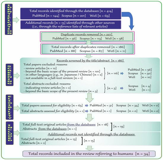 The literature search in English-language databases (i.e., PubMed, Scopus, and Web of Science) was conducted from November 2022 to January 2023 to collect relevant data. Only research articles written in English were reviewed and only abstracts in English from papers published in other languages were included. In the case of articles with an unavailable full text, correspondence contact was made, i.e., an email was sent to the corresponding author with a request for sending the full paper. In the absence of a reply, the information provided in the abstracts was included in the current report. To ensure comprehensive search of the literature, the reference lists of selected articles collected from the above-mentioned databases were manually reviewed to identify additional records (i.e., full-text papers or abstracts) that were potentially relevant to the topic.