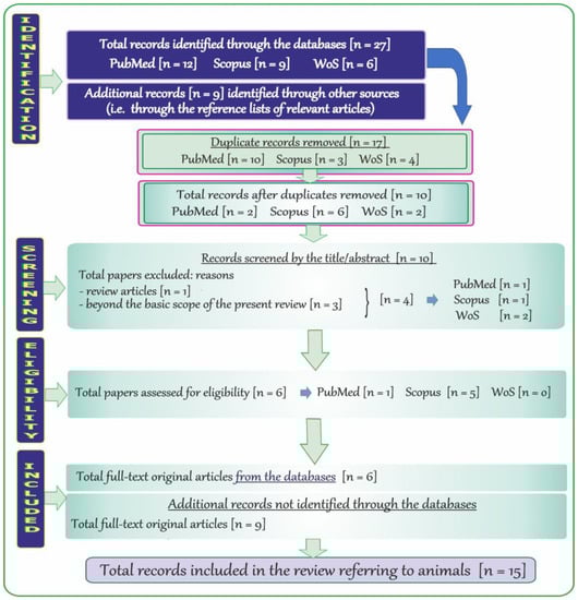 At the beginning, a total of 27 records published in English were revealed through the databases, i.e., 12 through PubMed, 9 through Scopus, and 6 through WoS. Next, a total of 17 duplicate records (PubMed: 10, Scopus: 3, and WoS: 4) were removed and the remaining items (n = 10; PubMed: 2, Scopus: 6, and WoS: 2) were initially screened by the titles and abstracts. Afterwards, records that were far beyond the topic addressed in the present review were excluded (n = 4; PubMed: 1, Scopus: 1, and WoS: 2), and six potentially relevant items (i.e., only full-text original articles) were further examined. Finally, a total of six full-text original papers in English and nine additional records (i.e., the relevant full-text original articles) were included (n = 15).