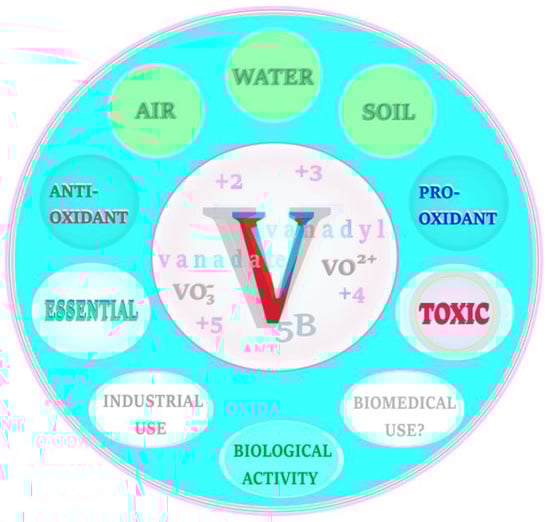 Vanadium is widely dispersed in the environment. It occurs in the air, soil, and water in variable concentrations and can be found naturally in about 65 different minerals []. It plays a large role in the industrial sector and exhibits multidirectional biological effects. This metal is also essential to some species in trace amounts, but can be toxic in excess. Moreover, in some conditions, vanadium can exert antioxidant properties, as evidenced by animal studies [,,,]. More details on the issues mentioned above have previously been provided in two review papers [,].