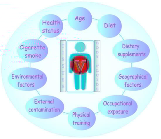 The level of vanadium in body fluids and tissues is influenced by several factors, such as age, diet, health status, or occupational exposure [,,]. As for the latter, elevated concentrations of this metal with a well-known industrial value [] have repeatedly been noted in body fluids of vanadium-exposed workers []. The environmental vanadium sources and geographical location are important as well [,,], and more details in this field are provided in further section of the present review. External contamination can also play a pivotal role. For example, Minoia et al. [] observed the release of vanadium, commonly used for steel production [], from stainless steel needles and syringes during blood collection. Moreover, the presence of vanadium in certain biomedical materials (e.g., in implants), reviewed previously [], from which vanadium can be released into surrounding tissues may be another factor affecting the level of this metal in the body. Recently, Łanocha-Arendarczyk and co-workers [] demonstrated a higher concentration of vanadium in spongy bone of the femoral head of patients with osteoarthritis inhabiting urban areas of Western Pomeranian (Poland), who had prosthetic implants and were occupationally exposed to various chemical substances, including heavy metals. Patients with implants also had a higher concentration of vanadium in cartilage []. As for the health status, Sampath et al. [] have recently supported the hypothesis that an imbalance of vanadium (the concentration of which was significantly reduced in the serum following treatment) is a factor in the etiology of one of mental illnesses, i.e., bipolar disorder. Furthermore, dietary supplements frequently used by athletes and body builders to improve performance [], in which vanadium may be present in the form of, e.g., vanadyl sulfate [], are equally important. As reported, the prolonged consumption of such supplements, with daily doses up to 18 mg V/day/person, may pose a risk of adverse health effects []. Additionally, smoking should be taken into account as one of the determinants of the concentration of vanadium in the organism [], as vanadium is contained in cigarettes at the mean level of 1.83 µg/g and approximately 30% of this metal is released in the smoke []. Therefore, both active and passive smokers may be exposed to higher levels of this element. However, the analysis of the available literature does not reveal any data on a rise in the concentration of vanadium in body fluids resulting from smoking. As reported in a study carried out by Toro-Román and co-workers [], physical training is another factor that can influence the level of vanadium in the organism. The authors demonstrated that regular physical training, especially aerobic sport modalities, causes an increase in the concentration of this metal in the serum. All the above-mentioned factors are graphically summarized in Figure 5.