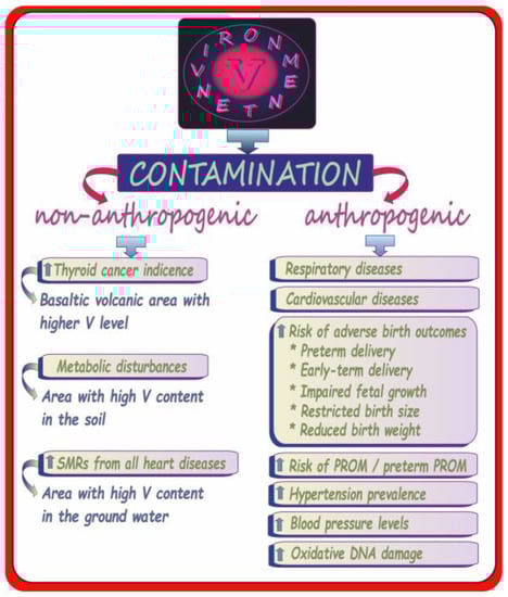 As presented in Figure 6, not only anthropogenic human activity resulting in the release of vanadium into the environment but also non-anthropogenic vanadium sources may lead to serious health consequences. As far as the non-anthropogenic contamination with vanadium is concerned, Malandrino et al. [] determined the concentrations of certain metals (also vanadium) in the tap water and lichens of the Mt. Etna volcanic area (Catania province), where an elevated thyroid cancer incidence has been reported to characterize the environmental pollution of that region, examined the urine of residents inhabiting the area to evaluate the level of biocontamination. The analyses demonstrated an eight-fold higher urinary vanadium concentration in the residents from the volcanic part of the country (0.16 µg/g creatinine) than in those living in the control area: 0.02 µg/g creatinine (i.e., in Palermo and Messina provinces). In turn, the concentration of vanadium in the tap water (19.9 µg/L) was almost 40 times higher than that found in the water from the control region (0.5 µg/L) [] and often exceeded the maximum admissible concentration []. A significant correlation between the urinary vanadium concentration and the water vanadium level was also observed. These data suggest a possible relationship between the pollutants, including vanadium present in the volcanic regions and the increase in the thyroid cancer risk. A higher level of vanadium was also noted in the urine and some internal organs, e.g., kidneys (1.7-fold) and lungs (1.9-fold), in villagers inhabiting northeastern Thailand (where some metabolic problems such as, e.g., distal renal tubular acidosis occur), compared to residents in the central area. Additionally, examinations of the level of vanadium in the soil showed that the surface soil in the northeastern areas exhibited a three-fold higher vanadium concentration than the central part of the country []. As suggested by the authors, the high vanadium intake following the prolonged consumption of natural agricultural products and the iron deficiency noted in northeastern Thailand may have led to the elevated tissue and urine vanadium contents. At this point, the findings of the interaction of dietary iron levels on the toxicity of vanadium in chicks conducted by Blalock and Hill [] are worth mentioning. The authors reported a rise in the degree of toxicity in iron-deficient animals accompanied by an increase in vanadium. More precisely, they showed that the iron-deficient animals retained more vanadium in the blood and liver, but the absorption of this metal was not influenced by the concentration of iron in the diet. In the case of villagers from northeastern Thailand, the concentration of vanadium in the liver was about 1.9-fold higher than in dwellers from the central part of the country []. Based on these data, it may be supposed that the accumulation of vanadium in tissues accompanied by iron deficit may have led to the development of renal acidosis in the villagers inhabiting northeastern Thailand. In turn, the work of Seko et al. [] revealed the highest standardized mortality rates (SMRs) from all heart diseases in one of the eight secondary medical districts in Yamanashi prefecture (i.e., in Fuji-hokuroku, a high-vanadium area) in Japan, where the groundwater used as a source of tap water by habitants is relatively rich in vanadium (its concentration is about 50 µg/L around the mountain). These data allow suggesting an adverse effect of the vanadium-rich groundwater from Mt. Fuji on the health of habitants living around the mountain in that region.