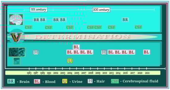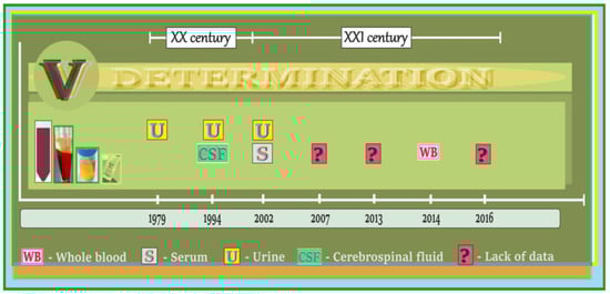 The first reference on the detection of vanadium in biological samples (i.e., CSF) obtained from patients with one of the neurodegenerative diseases, i.e., AD, appeared at the end of the 20th century, in 1983. Generally, in the 1980s and 1990s, there were not many investigations based on measurements of vanadium in biological specimens from subjects suffering from neurodegenerative illnesses. More papers on vanadium accumulation in this research area have been published since the beginning of the 21st century, which may reflect the increasing interest in the effects of vanadium on the development of neurodegenerative processes. To date, a total of 21 articles on the level of vanadium in AD, PD, or ALS patients have been issued. Except for five papers published in the 20th century, i.e., in 1983 (CSF), 1987 (BR), 1987 (H), 1989 (BR), and 1991 (CSF), sixteen articles were issued in the 21st century: in 2002 (BR), 2003 (BR), 2004 (CSF/BL/U), 2005 (BL), 2005 (BL), 2007 (BL), 2008 (CSF/BL), 2009 (CSF), 2010 (H), 2013 (CSF/BL), 2014 (BL), 2016 (BR), 2016 (BL), 2017 (BL), 2020 (CSF), and 2021 (BL).