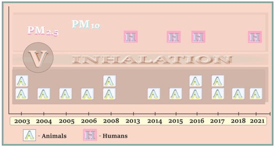 A summary of studies on the neurotoxic effects of vanadium in humans exposed to vanadium-bound PM2.5/PM10, and in animals after inhalation, is illustrated in Figure 9. As shown, there are only a few literature reports describing the effects of neurotoxicity related to the exposure of humans to vanadium-bound PM2.5/PM10. They were published in 2013, 2015, and 2016 by Calderón–Garcidueña’s research group [,,] and in 2021 by Yu and co-workers []. More articles in the analyzed research field, i.e., 15 in total, refer to animals exposed to vanadium through inhalation. Three of these papers (published in 2003, 2008, and 2017) refer to animals naturally exposed to urban air and the other twelve reports (published in 2003, 2004, 2005, 2006, 2008, 2014, 2015, 2016, 2017, 2018, and 2021) provide results of the studies on laboratory animals (rats and mice). More details on the neurotoxic effects of vanadium in humans exposed to PM2.5/PM10 rich in this metal, as well as in animals, are concisely summarized in further sections of this review.