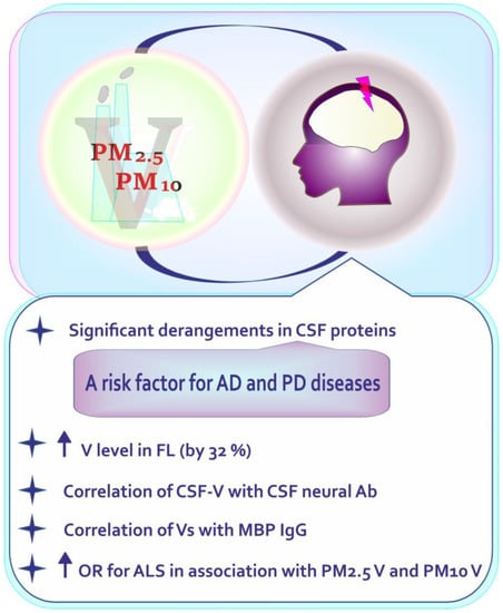 Summary of data on the neurotoxic effects of vanadium-associated PM2.5/PM10 exposure in humans. Elaborated on the basis of available literature data [,,,]. PM2.5: particles with aerodynamic diameters less than 2.5 µm, PM10: particles with aerodynamic diameters less than 10 µm, PM2.5V: PM2.5 vanadium fraction, PM10V: PM10 vanadium fraction, CSF: cerebrospinal fluid, CSF-V: CSF-V concentration, VS: vanadium in the serum, MBP: myelin basic protein, IgG: immunoglobulin G, FL: frontal lobe, Ab: antibody, AD: Alzheimer disease, PD: Parkinson disease, OR: odd ratio; ALS: amyotrophic lateral sclerosis, V: vanadium. ↑: increase.