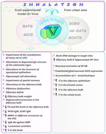 The present section is focused on the neurotoxic effects of vanadium both in laboratory animals and in those naturally exposed to urban air. Summarized data on this topic, whose main aim is to provide the reader with greater insight into the issues related to the influence of vanadium on CNS, are listed in Figure 11.