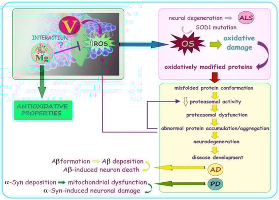 It should be emphasized that vanadium is at the forefront among the different elements studied for their potential therapeutic use, due to its anti-viral, anti-bacterial, anti-parasitic, anti-fungal, anti-allergic, anti-cancer, anti-diabetic, anti-hypercholesterolemic, anti-inflammatory, anti-ulcer, cardio-protective, nephro-protective, and neuro-protective activity []. On the other hand, it can accumulate and act as a strong pro-oxidant [], which limits the use of this metal in the treatment of some modern-age diseases in humans. Therefore, minimization of the adverse effects and pro-oxidative activity of vanadium may contribute to the development of effective therapeutic approaches in which this element could be used. It should also be highlighted that OS, i.e., a deleterious process generated by vanadium, has been reported to be implicated in neurogenerative mechanisms in the pathogenesis of some neurodegenerative disorders [] that have been described in one of the previous sections of the current report. A brief summary of the background data on vanadium are graphically presented in Figure 4.