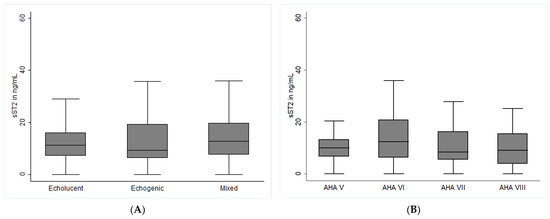 The baseline levels of circulating sST2 were similar in asymptomatic and symptomatic patients (10. 9 ng/mL, IQR 6.4–17.8 vs. 11.0 ng/mL, IQR 5.7–17.7, p = 0.965, Table 1). In logistic regression analysis, sST2 was not associated with symptomatic carotid artery stenosis (B = −0.105, 95% CI −0.432–0.214, p = 0.517). There was also no association of sST2 with carotid plaque morphology as determined by carotid ultrasound (B = 0.051, 95% CI −0.145–0.248, p = 0.609) and histological AHA classification (B = −0.032, 95% CI −0.194–0.130, p = 0.698). As depicted in Figure 1A, patients with echogenic, echolucent, and mixed plaques had similar sST2 concentrations (p = 0.810 across groups). There was also no difference in sST2 between groups according to histological AHA classification (Figure 1B, p = 0.248 across groups). In the multivariable logistic regression model, age (B = 0.023, 95% CI 0.001–0.045, p = 0.038), male sex (B = 6.8, 95% CI 3.1–10.4, p < 0.001), and coronary artery disease (CAD, B = 7.6, 95% CI 2.3–12.9, p = 0.005) were significantly correlated with baseline sST2 levels, while there was a tendency for peripheral artery disease (PAD, B = 3.1, 95% CI −0.3–6.5, p = 0.073); however, it did not reach statistical significance.