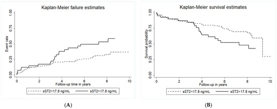 Cumulative incidence of adverse cardiovascular events and Kaplan-Maier survival estimates for all-cause mortality according to circulating sST2 levels. Kaplan-Meyer analyses for the cumulative incidence of adverse cardiovascular events (primary endpoint, panel (A)) and Kaplan-Maier survival estimates for all-cause mortality (panel (B)) according to baseline circulating sST2 levels. Circulating sST2 was measured as described in the methods section. The group with circulating sST2 above the cut-off of 17.8 ng/mL is indicated by the full line, and the dotted line indicates the group with sST2 below the cut-off.