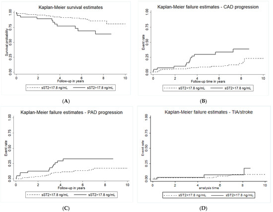 In the exploratory analysis of individual outcome endpoints, sST2 significantly predicted cardiovascular mortality (log-rank p = 0.013, Figure 3A), the progression of CAD and myocardial infarction (log-rank p = 0.004, Figure 3B), as well as the progression of PAD (log-rank p = 0.012, Figure 3C). In contrast, baseline sST2 did not predict future TIA/stroke, or carotid artery restenosis (log-rank p = 0.193, Figure 3D).