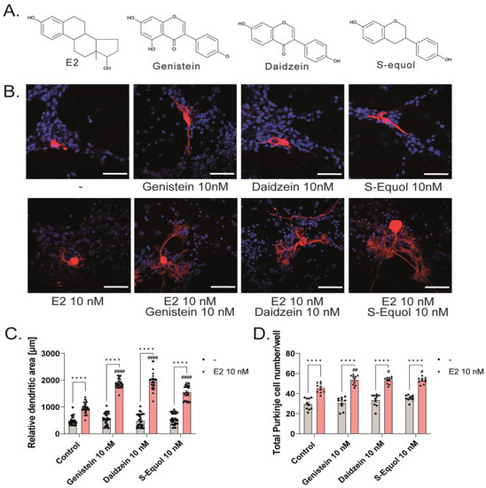 A primary culture of cerebellar cells was prepared as described previously [5,25,54] with slight modifications. Pregnant mice (C57BL/6) were purchased from Japan SLC (Hamamatsu, Japan) and fed with CE-2 standard rodent diet from CLEA Japan, Inc. At postnatal day 1, mouse cerebellar tissue was digested with papain dilution buffer (0.2 units/mL papain (Worthington, Lakewood, NJ, USA) in phosphate-buffered saline (PBS) containing 0.2 mg/mL l-cysteine, 0.2 mg/mL bovine serum albumin (Intergen Company, Purchase, New York, NY, USA), 5 mg/mL glucose, and 0.02 mg/mL DNase I (Sigma)) or underwent continued shaking at 37 °C for 25 min. Cells were resuspended in a cerebellar culture medium (Dulbecco’s Modified Eagle’s Medium/F12 (DMEM/F12) (Fujifilm Wako Pure Chemical Co., Ltd., Kanagawa, Japan) containing 1% penicillin–streptomycin (Wako), 3.9 mM glutamine (Wako), 2.1 mg/mL glucose (Wako), 30 nM sodium selenite (Sigma), 20 mg/mL insulin (Sigma), and 200 mg/mL transferrin (Sigma)). Dissociated cell suspensions were counted, and 3 × 105 cells/0.3 mL cerebellar cells were plated in poly-l-lysine-coated 8 mm diameter wells of chamber slides (Lab-Tek; Nunc International, Rochester, New York, NY, USA). E2, genistein, daidzein (Sigma), or S-equol (Cayman) at concentrations of 10 nM were added to the culture medium 16–24 h after plating. One-half of the cerebellar culture medium was replaced with fresh medium every 3 days and incubated in a 5% CO2 incubator at 37 °C.