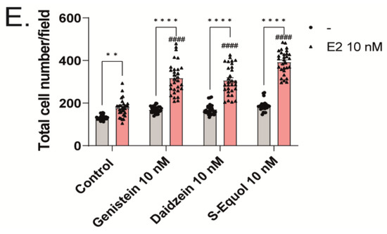 Our previous study showed that S-equol augmented the TH-mediated dendrite arborization in Purkinje cells in the primary cerebellar culture, and co-exposure with ER or GPER1 inhibitors significantly reduced the effect [5]. However, whether TH plays some roles in this system through TH receptor (TR)-dependent, TR-independent, or crosstalk of ER–TR signaling pathways cannot be excluded. To elucidate the effects of isoflavones on the dendrite arborization in Purkinje cells, we observed the effects of isoflavones in the primary cerebellar cultures without TH supplementation. The culture cells were maintained in a serum-free medium, and dendrite arborization in Purkinje cells was induced by adding E2 (10 nM) and/or genistein, daidzein, or S-equol (10 nM) (Figure 1A) to the culture medium. In addition to Purkinje cells, these cultures contained granule cells, astrocytes, and interneurons. The cells were cultured for 17 days and then fixed and immunostained with an anti-Calbindin D-28K antibody to visualize dendrite arborization in Purkinje cells; the dendritic area in Purkinje cells was measured and the total number of cells was counted. Representative photomicrographs after E2 and/or isoflavone exposure are shown in Figure 1B. We found that isoflavones enhanced E2-mediated dendrite arborization in Purkinje cells, and no significant difference was observed between the control and isoflavone-only groups (Figure 1C). Furthermore, isoflavones also increased the total number of cells, particularly Purkinje cells, in the primary cerebellar cultures (Figure 1D,E). These results indicate that isoflavones with E2 affected both neurons and glial cells and induced dendritogenesis and cell proliferation during cerebellar development. However, the molecular mechanism underlying these effects should be addressed further.