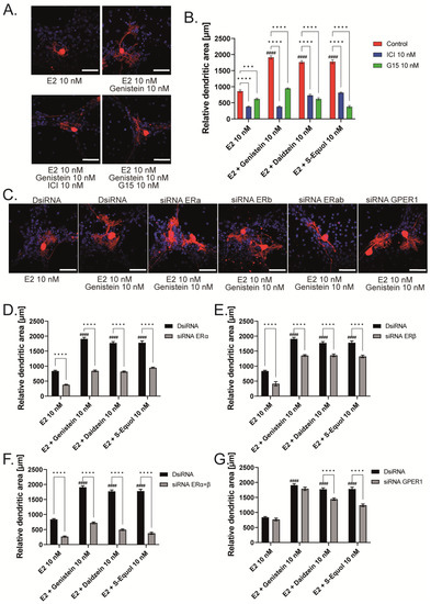 Isoflavones exert their action mainly by binding to either ERα or ERβ of the nuclear isoforms of ER, which then bind with an estrogen-responsive element located in the promoter region of the target genes to regulate gene transcription. In addition to nuclear ERs, isoflavones also bind to GPER1 and activate several intracellular signaling pathways [1,2,3,6,14]. Therefore, to examine the involvement of ER and GPER1 in dendritic outgrowth in Purkinje cells, we exposed the cells to isoflavones with G15, a GPER1 antagonist, or ICI 182,780, an ER antagonist. Co-exposure with 10 nM ICI 182,780 or G15, suppressed the isoflavone-augmented dendrite arborization in Purkinje cells (Figure 2A,B). We also observed the involvement of ER in dendritic outgrowth in Purkinje cells; we used siRNAs against ERα, ERβ, or GPER1 to knockdown their RNA expression in a primary culture of cerebellar cells. The mRNA levels after siRNA treatment were confirmed to be significantly suppressed (Figure S1). We also performed double knockdown of both ER mRNAs. DsiRNA as a control did not significantly affect dendrite arborization in Purkinje cells. In contrast, the knockdown of ERα and/or ERβ significantly reduced dendrite arborization in Purkinje cells (Figure 2C–F). Furthermore, the knockdown of GPER1 also suppressed daidzein- and S-equol-augmented dendrite arborization in Purkinje cells. However, no significant difference was observed in the genistein group (Figure 2G). These results indicate that ER and GPER1 are essential for dendrite arborization in Purkinje cells. However, it should be noted that we were unable to confirm whether the knockdown of ER or GPER1 directly affected Purkinje cells or that this effect was mediated by other cellular subsets.