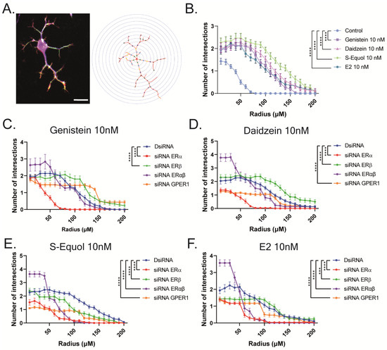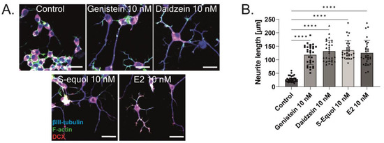 Mouse neuroblastoma-derived clonal cells, Neuro-2A cells (Japanese Cancer Research Resources Bank cell bank (National Institutes of Biomedical Innovation, Health, and Nutrition, Tokyo, Japan)), were cultured in DMEM (Wako) supplemented with 10% FBS and 100 U/mL penicillin and 100 µg/mL streptomycin (Wako) with 5% CO2 at 37 °C. The FBS was depleted of hormones using AGXI-8 resin (Bio-Rad, Hercules, CA, USA) through constant mixing and ultrafiltration. Then, 1 × 105 Neuro-2A cells/mL per well were plated in poly-l-lysine-coated 6- or 24-well plates and cultured in DMEM + 10% FBS. The culture medium was changed to DMEM + 1% FBS on the next day with or without E2, genistein, daidzein, or S-equol (10 nM) to trigger differentiation [5]. Then, the cells were incubated at 37 °C in a CO2 incubator for 1–3 days and then used for RT-qPCR and immunocytochemistry. Neuro-2A cells were fixed with 4% PFA and then blocked with 5% FBS in PBS for 30 min. The cells were then immunostained with a neuronal marker, mouse anti-β-tubulin III (1:200; Sigma; catalog number: T8578) and rabbit anti-doublecortin (C–terminal) (1:200; Sigma; catalog number: D9818) antibodies, followed by secondary antibody donkey anti-mouse Alexa Fluor® 405 (1:200; Thermo-Fisher Scientific, Inc.; catalog number: A31553) and donkey anti-rabbit Alexa Fluor® 594 conjugate (1:200; Thermo-Fisher Scientific, Inc.; catalog number: A32740). F-actin was stained with CytoPainter Phalloidin-iFluor 488 reagent (Abcam; catalog number: ab176753). Neuro-2A cells were observed under a laser confocal scanning microscope with a 40× objective lens, pinhole 1 AU, image size 512 × 512 pixels, and bit depth 8 bit (Zeiss LSM 880). The cells were randomly selected to quantify the neurite length and perform Sholl analysis. Neurite length was measured by tracing the neurite outline of the cells using Fiji ImageJ (NIH). Sholl analysis was performed by manually tracing each cell using Adobe Illustrator (Adobe Inc., San Jose, CA, USA). The overlay of the transparent layer of the Neuro-2A cells was used to trace the neurite outgrowth, followed by Sholl analysis using Fiji ImageJ (NIH). Intersections between neurites and each concentric circle were measured and analyzed.