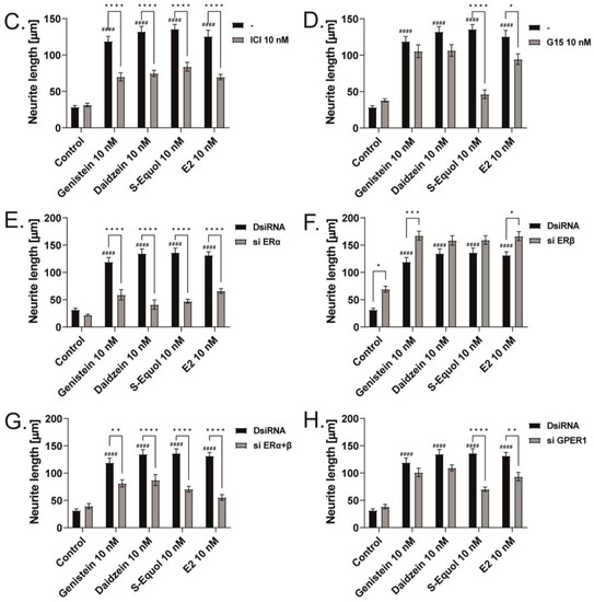 As shown in Figure 1 and Figure 2, the primary cerebellar cultures contain several subsets of cells. The action of isoflavones on the primary cerebellar culture may be mediated by their direct effects on Purkinje cells or via cell–cell interactions. Hence, to clarify the mechanism of action of isoflavones during development, we used a Neuro-2A cell differentiation model. The serum concentration in the culture medium was reduced to 1% to induce the differentiation of Neuro-2A cells. Anti-β-tubulin III for mature neurons and anti-doublecortin (DCX) for immature neurons or a neurogenesis marker were used in the Neuro-2A cells immunostained as neuronal markers [5,25]. E2 or isoflavones (10 nM) enhanced neurite outgrowth in Neuro-2A cells (Figure 3A,B). Neurite lengths were quantified using ImageJ Fiji (NIH). Using this system, we further elucidated the involvement of ER and GPER1 during isoflavone-induced neuritogenesis. Co-exposure with ICI 182,780 10 nM significantly suppressed isoflavone-induced neuritogenesis in Neuro-2A cells (Figure 3C). In contrast, co-exposure with the GPER1 inhibitor (G15 10 nM) only affected S-equol- and E2-induced neuritogenesis in Neuro-2A cells (Figure 3D). We also examined the mechanism using siRNA against ERα, ERβ, or GPER1 to knockdown RNA expression in Neuro-2A cells. A significant suppression in the mRNA levels after siRNA treatment was confirmed (Figure S1). Surprisingly, we found that only the knockdown of ERα significantly reduced isoflavone-induced neurite outgrowth in Neuro-2A cells (Figure 3E,G), whereas the knockdown of ERβ enhanced neurite outgrowth in the control, genistein, and E2 groups (Figure 3F). Furthermore, the knockdown of GPER1 reduced S-equol- and E2-induced neuritogenesis (Figure 3H). These results demonstrate that ERα is involved in the neuritogenesis in Neuro-2A cells that was induced by isoflavones.
