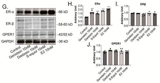Isoflavones are natural isoflavonoids mainly produced by leguminous plants, such as soybean and red clover [1,2,3]. Genistein (7,4’-dihydroxy-6-methoxyisoflavone) and daidzein (7,4’-dihydroxyisoflavone) are widely known as isoflavone phytoestrogens, and S-equol (4’-methoxy-7-isoflavanol), a major daidzein metabolite, is also ranked in this group [2,4]. These compounds have activities similar to those of 17-β-estradiol (E2). Because of their structural similarity with E2, isoflavones can bind with and activate estrogen receptors (ERs), exerting agonistic or antagonistic effects [1,3]. Furthermore, isoflavones also activate the G-protein-coupled estrogen receptor (GPER1; also known as GPR30), which then initiates several intracellular signal transduction pathways to activate extracellular signal-regulated kinase 1/2 (ERK1/2) and/or Akt-mediated pathways [5,6,7,8]. Such various actions of isoflavones indicate that they act through several signaling pathways. Furthermore, isoflavones can also affect other pathways. For example, they bind to membrane receptors such as peroxisome proliferator-activated receptor-γ [1,9] and without binding to a specific receptor, they function as antioxidants [1,4,10]. Because of these multiple pathways, they modulate the transcription of estrogen-regulated genes and chromatin remodeling, the activity of protein kinases, and the action of various transcription factors [11,12]. Thus, the molecular mechanism of action of isoflavones has not yet been fully understood, although the major pathway may be mediated through ER or GPER1.