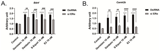 An RNA interference assay was performed as described previously [5,6,25,55] with slight modifications. The siRNAs were transfected into the primary cultured cerebellar cells or Neuro-2A cells using lipofectamine RNAiMAX reagent (Thermo-Fisher Scientific) according to the manufacturer’s protocol. The siRNA sequences against ERα, ERβ, GPER1, or negative control DsiRNA (Integrated DNA Technologies, Inc., Coralville, IA, USA) used in this study are listed in Table S1. Briefly, 1 nM of DsiRNA, ERα, ERβ, or GPER1 siRNA in siRNA lipid complexes was incubated for 20 min at room temperature. Primary cultured cerebellar cells or Neuro-2A cells were cultured until 80% confluences in 24-, 96-well, or 8 mm diameter wells of chamber slides in poly-l-lysine-coated dishes. Then, siRNA lipid complexes were added dropwise to the well. The qRT-PCR was performed to verify the efficacy of siRNA knockdown (Figure S1). The SuperPrep cell lysis and RT kits for qPCR reagent (TOYOBO Bio-Technology, Japan) were used to extract RNA, followed by qRT-PCR using THUNDERBIRD SYBR qPCR Mix (TOYOBO) according to manufacturer’s instructions and a StepOne RT-PCR System (Thermo-Fisher Scientific). The primers are listed in Table S2. qRT-PCR was performed as follows: denaturation at 95 °C for 20 s; amplification at 95 °C for 3 s; and 60 °C for 30 s (40 cycles). Data are presented as the mean ± standard error of the mean. More than three independent experiments were performed, using independent RNA preparations to ensure the consistency of the results. Glyceraldehyde-3-phosphate dehydrogenase (Gapdh) was used to normalize mRNA levels. The results were consistent between each experiment. A representative result from one experiment is shown.