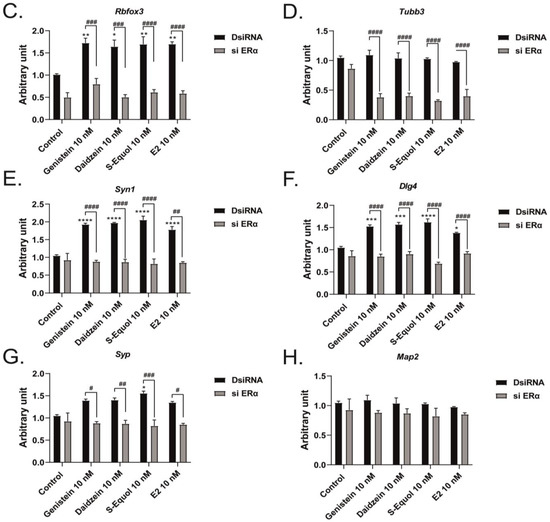 Effects of isoflavones on mRNA expression levels after the knockdown of ERα. Cells were induced to differentiate through serum starvation for 1–3 days, followed by RNA extraction, and continued with qRT-PCR. Changes in Bdnf (A), Camk2b (B), Rbfox3 (C), Tubb3 (D), Syn1 (E), Dlg4 (F), Syp (G), and Map2 (H) mRNA expression levels in Neuro-2A cells after ERα siRNA transfection (n = 9). Data are shown as the mean ± standard error of the mean and repeated three times, using independent RNA preparations to confirm the consistency of the results. mRNA levels were normalized against Gapdh. #### p < 0.0001, ### p < 0.001, ## p < 0.01, and # p < 0.05 indicate statistical significance according to two-way or one-way analysis of variance, followed by the post hoc Tukey test. **** p < 0.0001, *** p < 0.001, ** p < 0.01, and * p < 0.05 indicate statistical significance according to two-way or one-way analysis of variance, followed by the post hoc Tukey test compared to E2 (10 nM).
