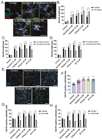 Co-culture assays were performed as described previously [25] with slight modifications. Co-culture studies were conducted by adding Neuro-2A cells with a density of 1000 or 10,000 cells per well onto monolayers of DIV7 cerebellar astrocyte-enriched culture (70–80% confluence) in 24- or 6-well plates. Co-culture was performed for 3 days, unless otherwise specified. E2, genistein, daidzein, or S-equol (10 nM) was added to the culture medium with or without ICI 182,780 or G15 (10 nM). The cells were fixed with 4% PFA, followed by blocking with 5% FBS in PBS for 30 min. Then, the Neuro-2A cells were immunostained with neuronal marker mouse anti-β-tubulin III antibody (1:200) followed by the secondary antibody donkey anti-mouse Alexa Fluor® 405 (1:200). F-actin was stained with CytoPainter Phalloidin-iFluor 594 reagent (Abcam). DAPI was used to stain the cell nuclei. The Neuro-2A cells were observed under a laser confocal scanning microscope with a 40X objective lens, pinhole 1 AU, image size 512 × 512 pixels, and bit depth 8 bit (Zeiss LSM 880, Carl Zeiss Microscopy GmbH). ImageJ Fiji (NIH) was used to measure the neurite length.