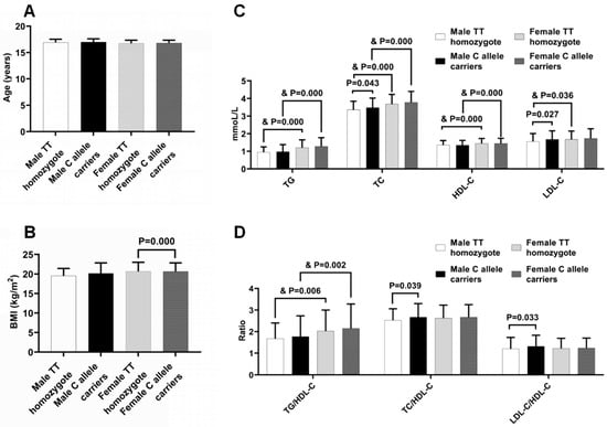 Anthropometric characteristics and plasma lipid profiles in subjects with different genotypes of LDLR rs5925. (A) Age. (B) BMI. (C) TG, TC, HDL-C, LDL-C. (D) TG/HDL-C, TC/HDL-C, LDL-C/HDL-C. Body mass index (BMI), triglycerides (TG), total cholesterol (TC), HDL-C, and low-density lipoprotein (LDL-C) cholesterol. & p values, when compared with those of males after the adjustment for BMI (Analyses of covariance). The remaining p values, when compared with those of males (One-way analyses of variance), or when compared to those of TT homozygotes (One-way analyses of variance).
