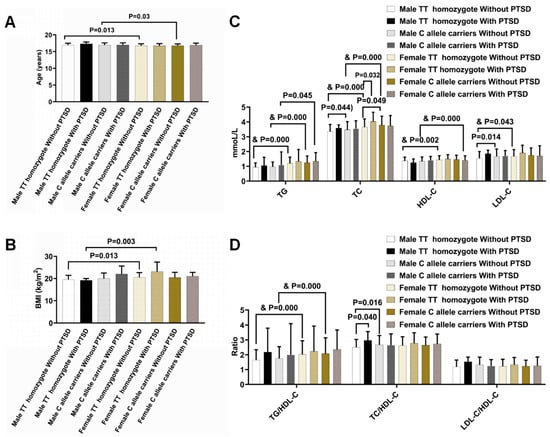 Anthropometric characteristics and plasma lipid profiles in the subjects with different genotypes of LDLR rs5925 and with or without PTSD. (A) Age. (B) BMI. (C) TG, TC, HDL-C, LDL-C. (D) TG/HDL-C, TC/HDL-C, LDL-C/HDL-C. Body mass index (BMI), triglycerides (TG), total cholesterol (TC), HDL-C, and low-density lipoprotein (LDL-C) cholesterol. & p values, when compared with those of males after the adjustment for BMI and/or age (Analyses of covariance). The remaining p values, when compared with those of subjects without PTSD (One-way analyses of variance), or when compared with those of males (One-way analyses of variance), or when compared with those of TT genotype (One-way analyses of variance).