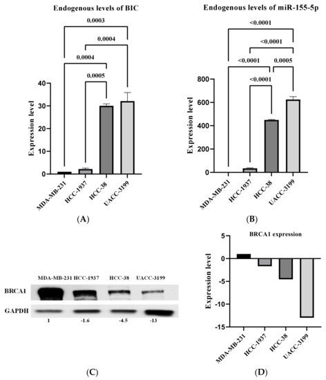 2.1. MicroRNA-155-5p Is Up-Regulated in BRCA1-Methylated Breast Cancer Cell Lines