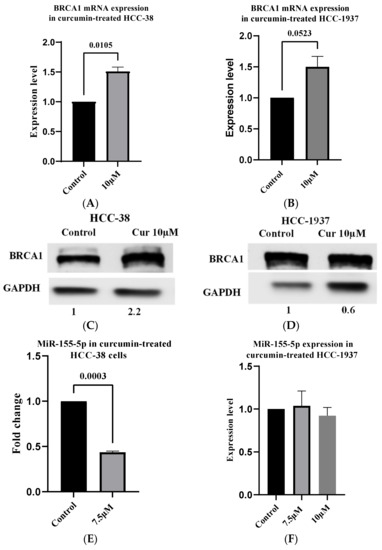 2.3. Curcumin Downregulates miR-155-5p in HCC-38 but Not in HCC-1937 via the Re-expression of BRCA1 Protein