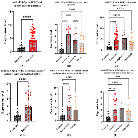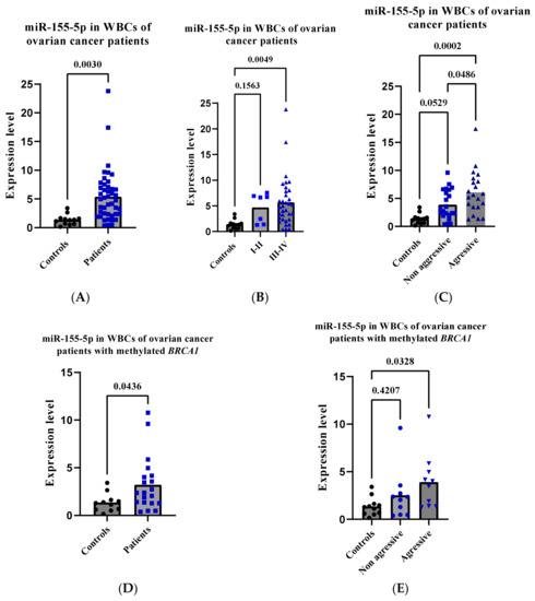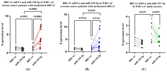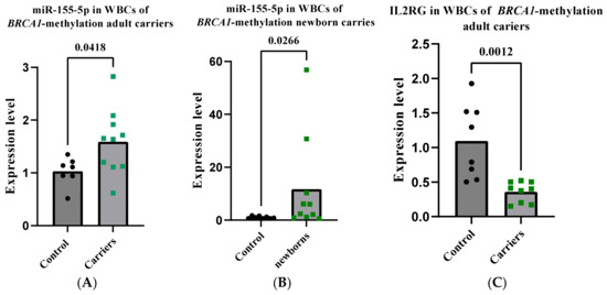 2.9. miR-155-5p Is Elevated in WBCs of BRCA1-Methylation Female Carriers