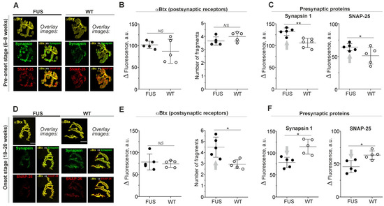 Labeling of nicotinic acetylcholine receptors (nAChRs) and presynaptic proteins in diaphragm NMJs of ΔFUS(1-359) mice vs. those of WT mice. (A–F) Comparison between ΔFUS(1-359) mice at pre-onset (A–C) and onset (D–F) stages and age-matched WT animals. (A,D) Representative fluorescent and overlay images. Scale bars—20 µm. (B,E) Fluorescence intensity of tetramethylrhodamine-conjugated αBtx and calculation of number of end-plate fragments. (C,F) Immunoexpression of synapsin 1 and SNAP-25. * p ˂ 0.05, ** p ˂ 0.01 according to Mann–Whitney U test compared to that for WT mice. n = 5–6 muscles from individual mice per group; 11–15 NMJs from each muscle. Arrows indicate an increase or decrease in parameter. NS—non significant.