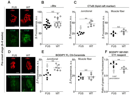 Changes in membrane properties of diaphragm muscle from ΔFUS(1-359) mice at pre-onset stage. (A,D) Typical fluorescent images of NMJs double-labeled with tetramethylrhodamine-conjugated αBtx and fluorescent CTxB or ceramide. Scale bars—20 µm. (B) Quantification of tetramethylrhodamine-conjugated αBtx fluorescence. (C,E) Intensities of CTxB (C) or ceramide (E) fluorescence in synaptic (junctional) and non-synaptic (muscle fiber) regions. (F) Ratio of green and red fluorescence of BODIPY 581/591 C11 reagent, an indication of lipid peroxidation. ** p ˂ 0.01 according to Mann–Whitney U test compared to that for WT mice. n = 6–7 muscles from individual mice per group (excluding 14–17 muscles for B); 14–15 NMJs from each muscle. Arrows indicate an increase or decrease in parameter. NS—non significant.