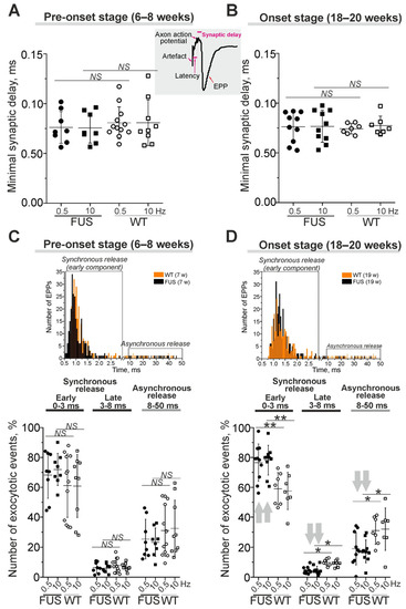 The kinetics of quantal neurotransmitter release under low external Ca2+ in diaphragm NMJs of ΔFUS(1-359) mice vs. those of WT mice. (A–D) Comparison between ΔFUS(1-359) mice at pre-onset (A,C) and onset (B,D) stages and age-matched WT animals. (A,B)—Quantifications of minimal synaptic delays of EPPs at 0.5 and 10 Hz nerve stimulation. Insert, synaptic delay and latency are depicted on typical EPP. (C,D)—Estimation of synchrony of exocytotic events. Shown portions (in%) of the evoked synaptic responses with short (0–3 ms), intermediate (3–8 ms) and long (8–50 ms) synaptic delays. Top, the histograms illustrating the synaptic delay distribution from separate experiments in WT and model animals; early synchronous and asynchronous components of the neurotransmitter release are boxed. * p ˂ 0.05, ** p ˂ 0.01 according to Mann–Whitney U test; NS—non significant. n = 7–12 muscles from individual mice per group; 300 EPPs were recorded in each muscle. Arrows indicate an increase or decrease in parameter.
