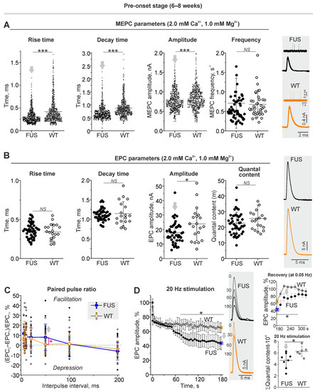Neurotransmission under normal external Ca2+ level in diaphragm muscles from ΔFUS(1-359) mice at pre-onset stage. (A) MEPC parameters (rise and decay time, amplitude and frequency). Right: typical MEPCs. (B) EPC parameters: rise and decay time, amplitude and quantal content under 0.5 Hz nerve stimulation. Right: representative EPCs. (C) Paired pulse ratio of EPC amplitudes at inter-pulse interval from 5 to 200 ms. (D) Kinetics of EPC amplitude (in%) under 20 Hz stimulation for 3 min. Typical EPCs recorded at 0, 30, 60 and 180 s of stimulation are shown. Top right: recovery of EPC amplitudes (at 0.5 Hz) after 20 Hz and 3 min stimulus train; boxed points (in orange and blue) are the last values of mean EPC amplitudes at the end of tetanus. Bottom right: cumulative quantal content illustrating total amount of quanta released during 3 min stimulation at 20 Hz. (A–D) (cumulative quantal content)—* p ˂ 0.05 and *** p ˂ 0.001 according to Mann–Whitney U test and (D) according to two-way ANOVA with Bonferroni correction between curves; NS—non significant. (A) n = 5 muscles from individual mice per group; MEPCs were recorded in 140–150 NMJs in each muscle for estimation of the temporal parameters and amplitude; for MEPC frequency analysis, 200–300 MEPCs were recorded in each of the 7–12 NMJs per muscle. (B) n = 5 muscles from individual mice per group; EPCs were detected in 5–9 NMJs in each muscle. (C,D) n = 6–8 muscles from individual mice per group; one NMJ in each muscle was tracked. Arrows indicate an increase or decrease in parameter.
