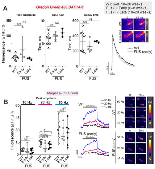 Calcium dynamics in presynaptic nerve terminals in levator auris longus muscle NMJs of ΔFUS(1-359) mice vs. those of WT mice. The figure shows a comparison between ΔFUS(1-359) mice at pre-onset (early phase, I; 6–8 week-old) and onset (late phase, II; 18–20 week-old) stages compared to WT (6–8 + 18–20 week-old) mice. (A) Parameters of intraterminal calcium transient upon single stimulus. WT: 47 NMJs of 9 mice; FUS I (early): 40 NMJs of 5 mice; FUS II (late): 17 NMJs of 3 mice. Right: typical traces of Ca transient and pseudocolor images of Oregon Green 488 BAPTA-1 fluorescence in the nerve terminals. Scale bars—20 µm. (B)Peak amplitude of one-minute stimulus train-induced increase in intraterminal calcium fluorescence of nerve terminals loaded with Magnesium Green. The motor nerve was stimulated at 10, 20 and 50 Hz. WT: 36 NMJs of 7 mice; FUS I (early): 19 NMJs of 6 mice; FUS II (late): 27 NMJs of 7 mice. Left: quantification of the peak fluorescence intensity. Center: typical traces of changes in Ca2+ fluorescence intensity. Right: representative pseudocolor images of Magnesium Green fluorescence in the nerve terminals. Scale bars—20 µm. * p ˂ 0.05 according to Mann–Whitney U test; NS—non significant. n = 3–9 muscles from individual mice per group; 7–10 NMJs were tested in each muscle.