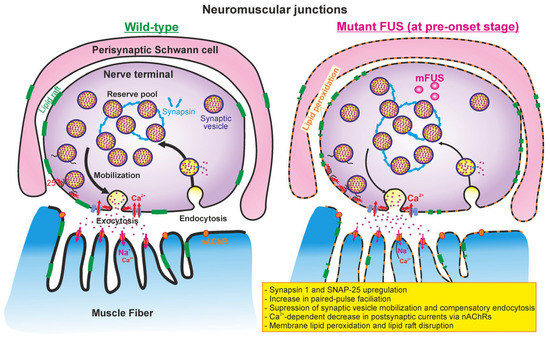 NMJ has a high safety factor for preserving muscle activity even under the conditions of nascent pathology and decreasing neuromuscular transmission. Early alterations in structural and functional properties of NMJs can be a triggering factor for dying-back neurodegeneration in both familiar and sporadic forms of ALS. Hence, attenuations of synaptic vesicle exo–endocytosis upon intense activity accompanied by synapsin 1 upregulation, lipid raft disturbance and lipid peroxidation can be a component of the complex pathogenetic mechanism behind ALS. Then, disorganization of end plates, alterations in AChR properties as well as downregulation of presynaptic proteins and changes in timing of neurotransmitter release appear to contribute to disease manifestation. Further molecular and genetic studies directed at reversing early NMJ alterations can help to reveal the roots of FUS-dependent pathology in ALS.
