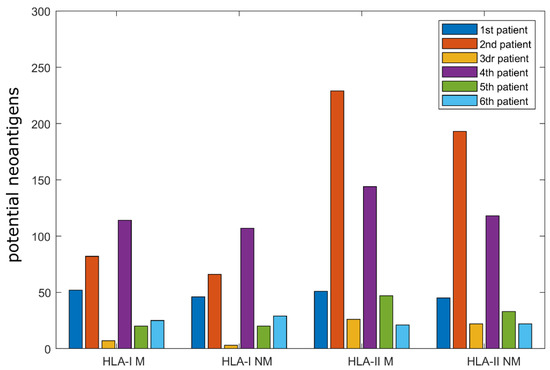 Our results indicated that, although the number of mutated peptides (i.e., potential neoantigens) presented higher binding affinity in almost every case, the difference was not significant when HLA-I binding affinity or Class I immunogenicity were compared. However, in the case of HLA-II, the number of mutated peptides was significantly higher compared to that of non-mutated peptides. Thus, this study answers, at least partially, the first question, regarding the capacity of these tools to identify potential neoantigens, particularly those that estimate Class II binding affinity. It must be mentioned that, even if the number of potential HLA-II binders was significantly higher in the case of neoantigens, this does not necessarily mean that the binding affinity of mutated peptides is higher. There might be other reasons, such as an overexpression of neoantigens with respect to the non-mutated peptides, etc. There are some tools that estimate the gene expression from the amino acid sequences of proteins, such as the one from [60], but that were hardly applicable to our work. Since this study was planned as a proof of concept of the methodology presented, the specific evaluation of the expression of neoantigens was left for future studies.