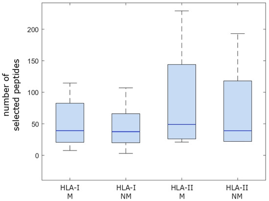 Box plot illustrating the distributions of the number of peptides that passed the respective cutoff points (≤1% for HLA-I and ≤10% for HLA-II binding affinity). M indicates mutated peptides, while NM references the non-mutated versions. The light blue boxes represent the distribution of the central 50% of the values and the dark blue lines represent the medians. The remainder of the values are represented by the arms.
