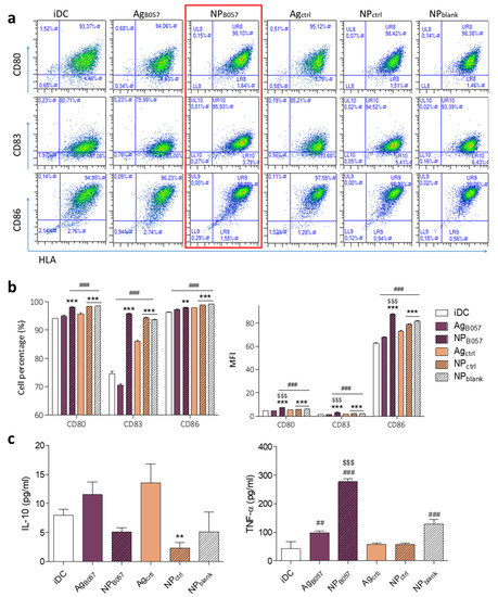 The final purpose was to activate T cells against the selected neoantigen, for which the process to be followed is very well described. Once the NP-entrapped neoantigens are taken up by DCs, they transform into mature DCs (mDCs), allowing them to present the antigen. During this process, they overexpress the surface markers HLA-DR, CD80, CD83, and CD86 [32,33].