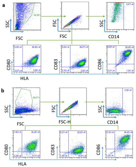 Schematic flow cytometry gating strategy to identify DCs. Two gating strategies were performed for SSC vs. FSC due to the complexity increment when matured with (a) NPs compared to when matured with (b) free neoantigens, suggesting NP uptake by DCs. Once target cells were characterized by size and granularity, singlets were selected, from which CD14 low cells were defined. DC maturation was determined with an HLA-DR maturation marker vs. CD80, CD83, or CD86.