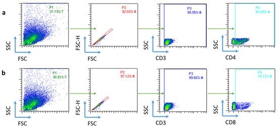 Schematic gating strategy to identify TCs. Cells were characterized by size and granularity, and discriminated by singlets for the selection of (a) CD4- or (b) CD8-positive T cells. Proliferation analysis (CFSE signal) was conducted from these gating strategies.