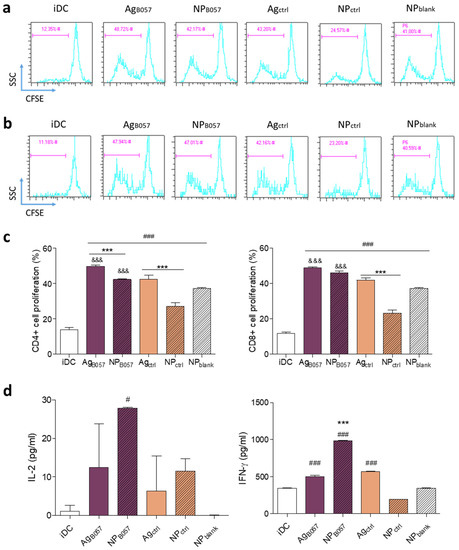 T lymphocyte activation at day 5 after co-culture with autologous DCs at a 1:10 DC:T cell ratio. Representative flow cytometry plots of CFSE-stained (a) CD4+ and (b) CD8+ T cells. (c) CD4+ and CD8+ lymphocyte proliferation response in cell percentage (%) induced by DCs. (d) IL-2 and IFN-γ cytokine release. Proliferations were analyzed in triplicate and cytokines were analyzed in duplicate (# p < 0.05 and ### p < 0.001 with regard to iDCs; *** p < 0.001 with regard to free antigen; &&& p < 0.001 with regard to the homologous control).