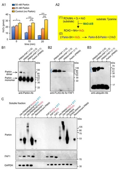 Characterization of the basic properties of the redox molecule Parkin and its substrate FAF1. (A1): MAO Assay: Parkin reacts with and reduces H2O2, a by-product of the chemical reaction between MAO-A and tyramine. Error bars represent the mean ± SD values of three experiments; statistical analysis was calculated using one-way ANOVA, followed by the Bonferroni Multiple Comparison test. *** p < 0.0001; * p < 0.05. (A2): Chemical reaction equations of MAO with tyramine and of Parkin protein with H2O2. (B): WB for FAF1 Polyubiquitination Assay using the Parkin E3 ligase; E3 activity does not allow autoubiquitination. (B1): WB analysis using anti-Parkin antibodies. (B2): WB analysis using anti-FLAG antibodies for FAF1. (B3): WB analysis using anti-Ubi antibodies. The same WB membrane was used for all of (B1–B3). (C): Overexpression of Parkin/FAF1 in HEK293 (HEK) cells with/without H2O2: WB for soluble fractions. 20 mM H2O2 or 100 mM DTT were exposed for 30 min at room temperature. DTT was added 5 min before collecting the cells.