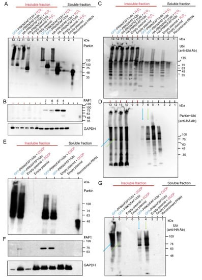 Hydrogen peroxide (H2O2) exposure to HEK cells transfected with GFP-Parkin or HA-Parkin, FAF1, and Ubi. Twenty-four hours after transfections, HEK cells were treated with H2O2 (20 mM, 30 min), and separated into Triton X-100 soluble and insoluble fractions. (A): WB for soluble and insoluble fractions using an anti-Parkin antibody. (B): WB for soluble and insoluble fractions using anti-FLAG antibodies for FAF1. (C): WB for soluble and insoluble fractions using anti-Ubi antibodies. (D): WB for soluble and insoluble fractions using anti-HA antibodies for Ubi and HA-Parkin. The same WB membrane was used for all of (A–D). CCCP exposure to HEK cells were transfected with GFP-Parkin, FAF1, and Ubi. Twenty-four hours after transfection, the cells were treated with CCCP (20 μM, 6 h) and then separated into triton X-100 soluble and insoluble fractions. (E): WB for soluble and insoluble fractions using anti-Parkin antibodies. (F): WB for soluble and insoluble fractions using anti-FLAG antibodies for FAF1. (G): WB for soluble and insoluble fractions using anti-HA antibodies for Ubi. The same WB membrane was used for all the figures in (E–G).