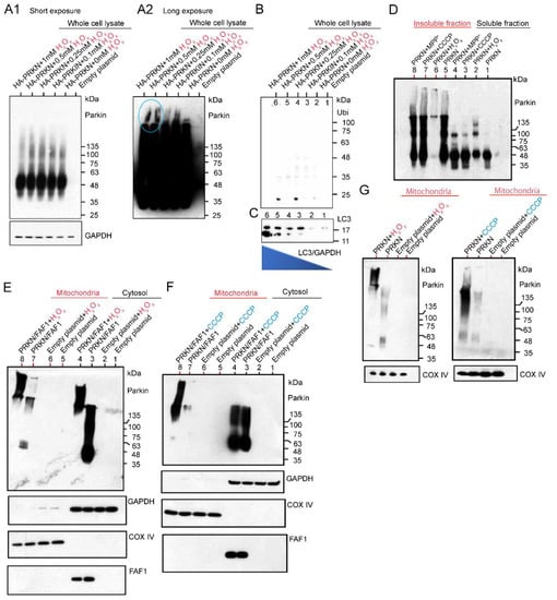 Exposure of HA-Parkin over-expressed HEK cells with different concentrations of H2O2. Twenty-four hours after transfection, HEK cells were treated with H2O2, and whole cell lysates (WCL) were prepared and utilized for WB analysis. (A1,A2): WB for WCL using an anti-Parkin antibody. WB results were evaluated at different exposure times. (B): WB for WC using an anti-Ubi antibodies. (C): WB for WCL using anti-LC3 antibodies. The same WB membrane was used for all of (A–C). H2O2 (20 mM) and CCCP (20 μM) effect in Triton X-100 soluble and insoluble fractions from HEK cells overexpressing untagged Parkin alone. (D): WB for soluble and insoluble fractions using anti-Parkin antibodies under non-reducing conditions. H2O2 vs. CCCP effect in mitochondrial and cytosolic fractions from HEK cells overexpressing untagged Parkin/FAF1 (E,F) or untagged Parkin alone (G).